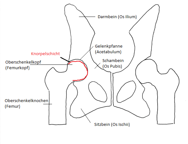 Der Femurkopf wird vom Ligamentum capitis femoris (Hüftkopfband) – das ist ein dünnes, dreieckiges Band, das innerhalb des Hüftgelenks durch die Gelenkkapsel zieht – der Gelenkkapsel und der umliegende Muskulatur im Acetabulum (Gelenkpfanne) gehalten. Das Acetabulum wird von allen drei Hüftknochen – Darmbein (Os ilium), Sitzbein (Os ischii) und Schambein (Os pubis) – gebildet und bildet somit die Pfanne für das Hüftgelenk. So sieht der gesunde Zustand einer Hüfte schematisch in der Grafik dargestellt aus: