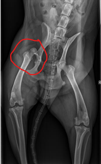 Kolia erlitt einen Sturz aus hoher Höhe und landet sehr unglücklich auf seiner Hüfte. Die Folge war eine traumatisch bedingte einseitige Femurkopfluxation, d.h. soviel wie der Oberschenkelkopf (Femurkopf) ist aus der Gelenkpfanne (Acetabulum) gesprungen. Eine eher seltene und wie man sich vorstellen kann eine sehr schmerzhafte Angelegenheit. Auf dem Röntgenbild sah das dramatischerweise dann so aus: